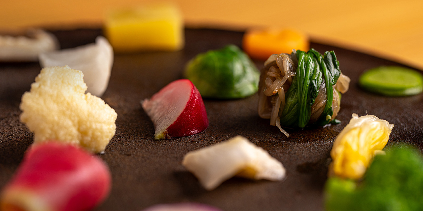 野菜の種類ごとに仕込みの時間や調理法を変えて、食材本来の良さを活かした状態で一口ずつお愉しみいただく一皿です。